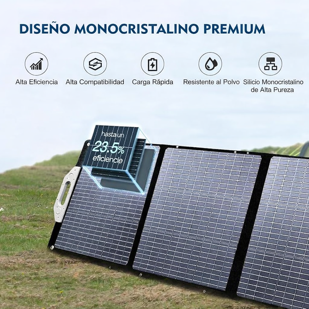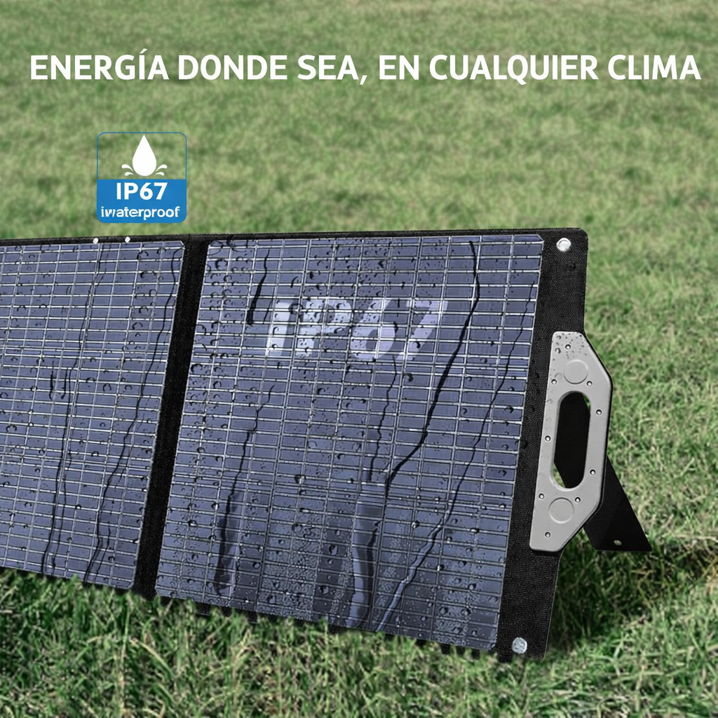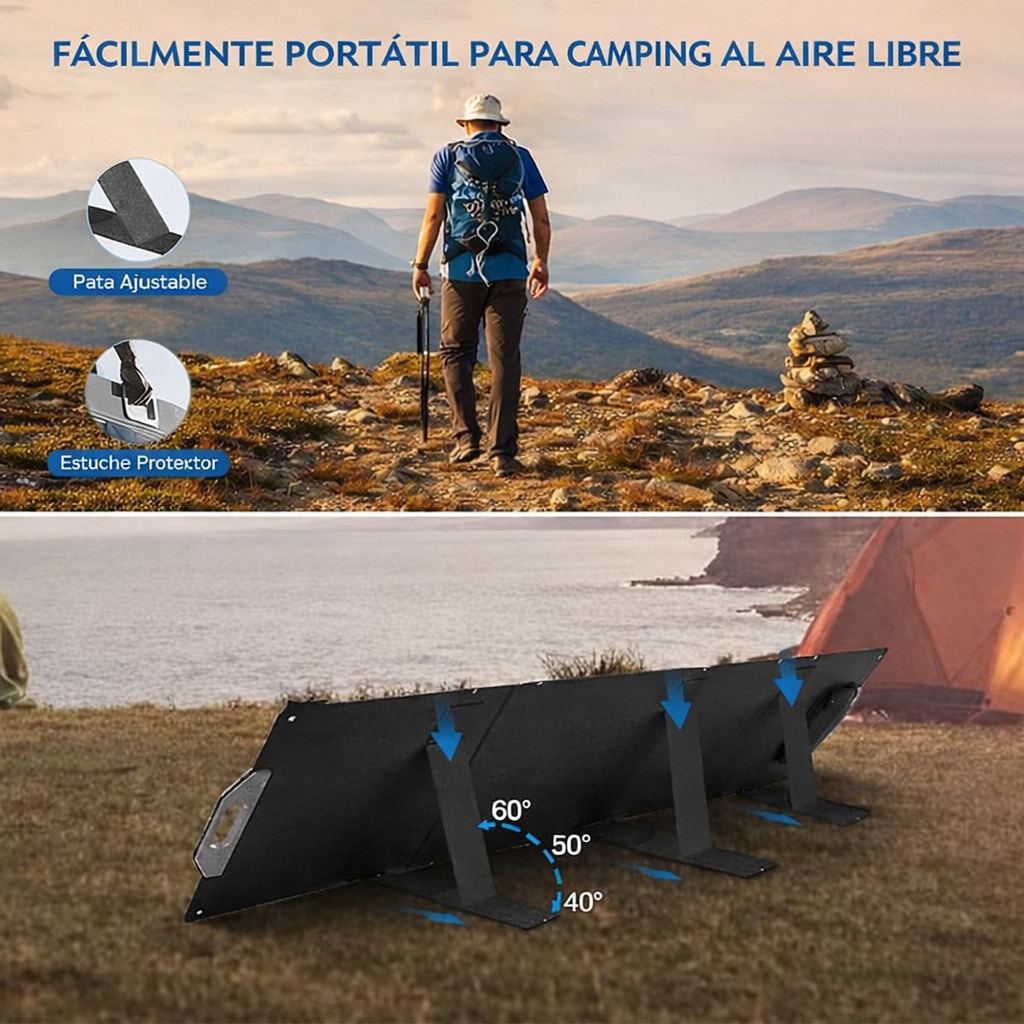 Diseño Plegable con Soportes Ajustables: A pesar de su gran potencia, se pliega de forma compacta y cuenta con 3 soportes integrados para ajustar el ángulo de incidencia solar y maximizar la carga durante todo el día.