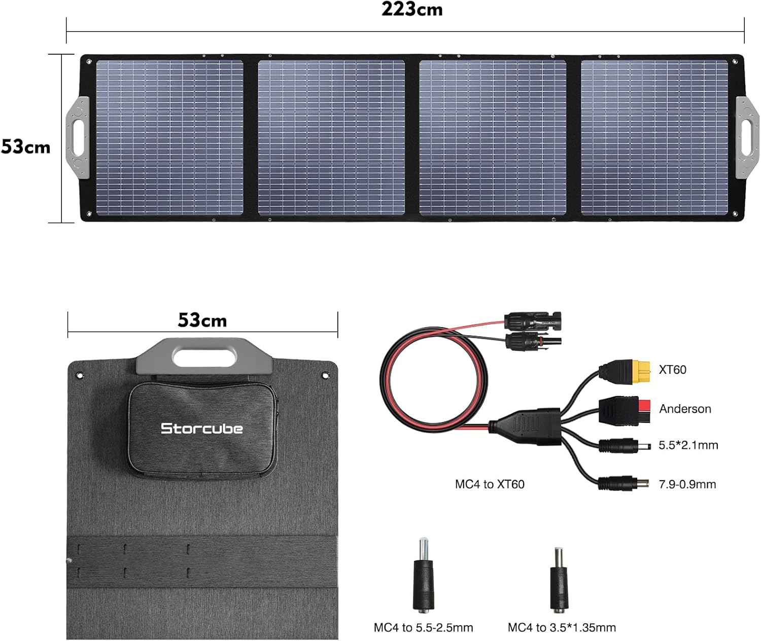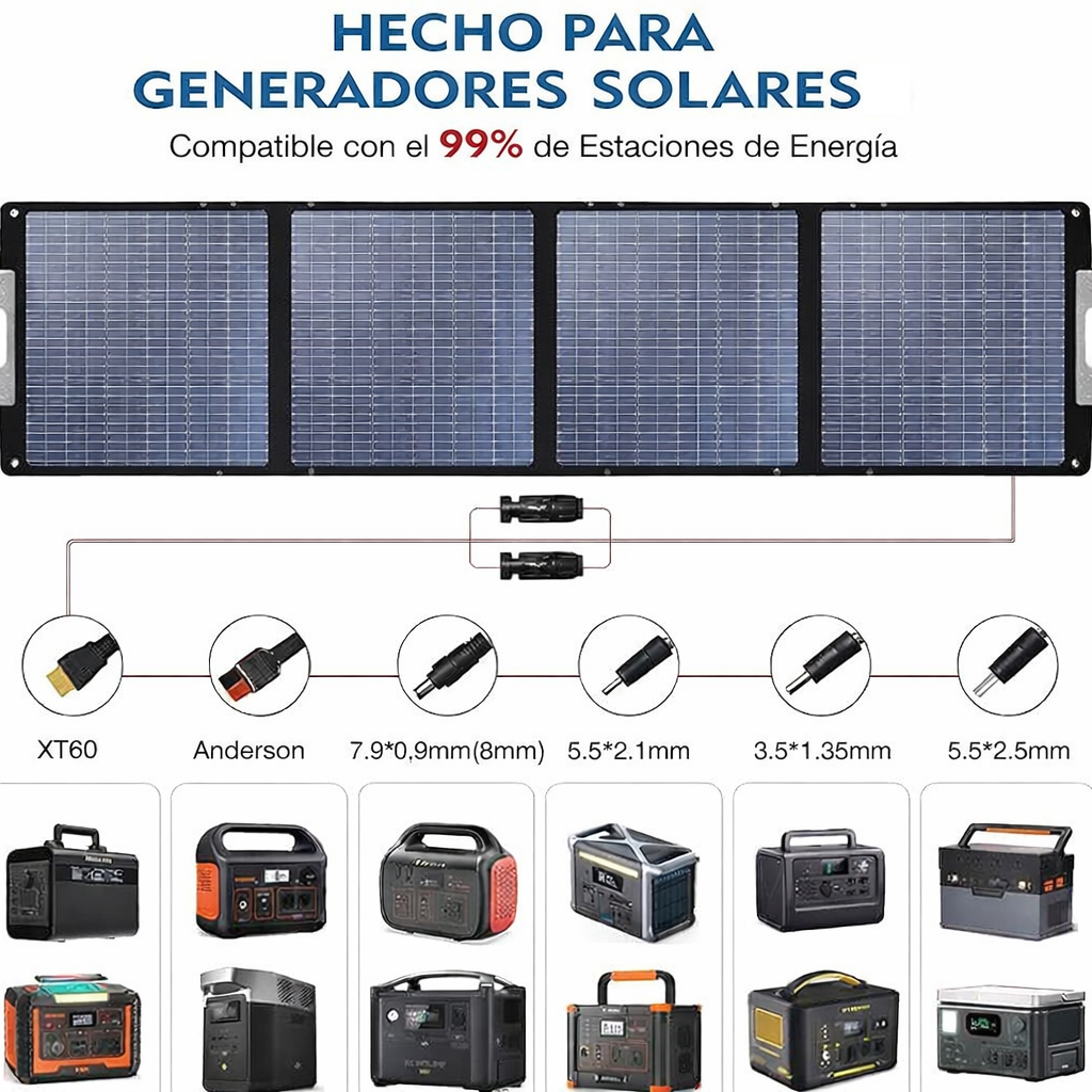 – Tipo de Conector: MC4 (Incluye cable con salida Anderson/XT60 y adaptadores de CC: 8mm / 5.5×2.5mm / 3.5×1.35mm / 5.5×2.1mm).
